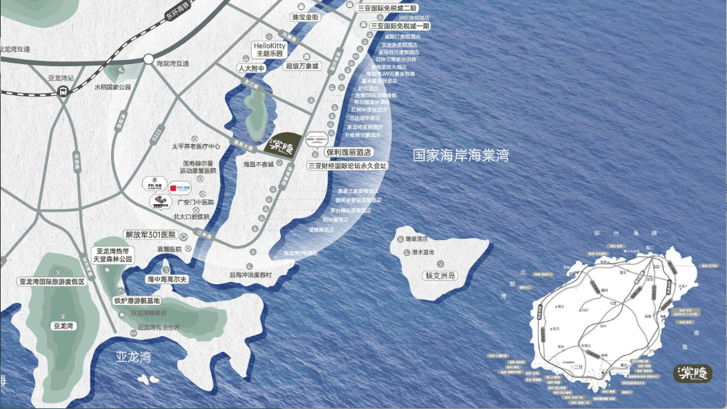 海棠湾核心地段,临海面河,玉带缠腰,河海汇聚呈“敛财”之势,背靠中国30000公里海岸线上最高的地标建筑保利瑰丽酒店,远侧是连绵起伏的环山,藏风聚气,得水为上,上风上水的绝佳风水宝地;