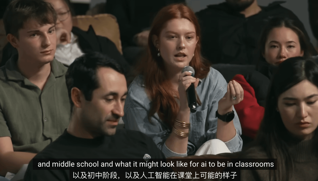 提问者 Claire:我想回到刚才关于教育的话题。我叫 Claire,是伯克利的大二学生,主修认知科学和设计。我在高中时,就看到身边的同学用 ChatGPT 写作文、做作业。现在到了大学,我们在各个层面讨论 AI 政策、课程设置、CS、人文等等。我想回到更早的阶段,比如幼儿园和中学,那是人真正学会如何解决问题、如何写作、如何思考的时期。作为一名父亲,你怎么看 AI 在这些非常关键的成长阶段,会如何影响、塑造教育?