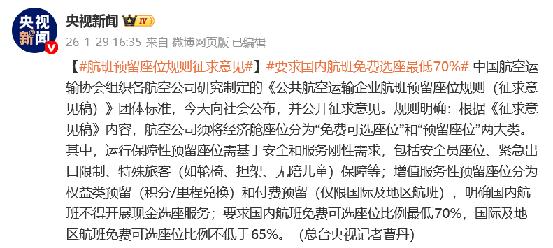 1月29日,中国航空运输协会组织各航空公司研究制定的《公共航空运输企业航班预留座位规则(征求意见稿)》团体标准,今天向社会公布,并公开征求意见。