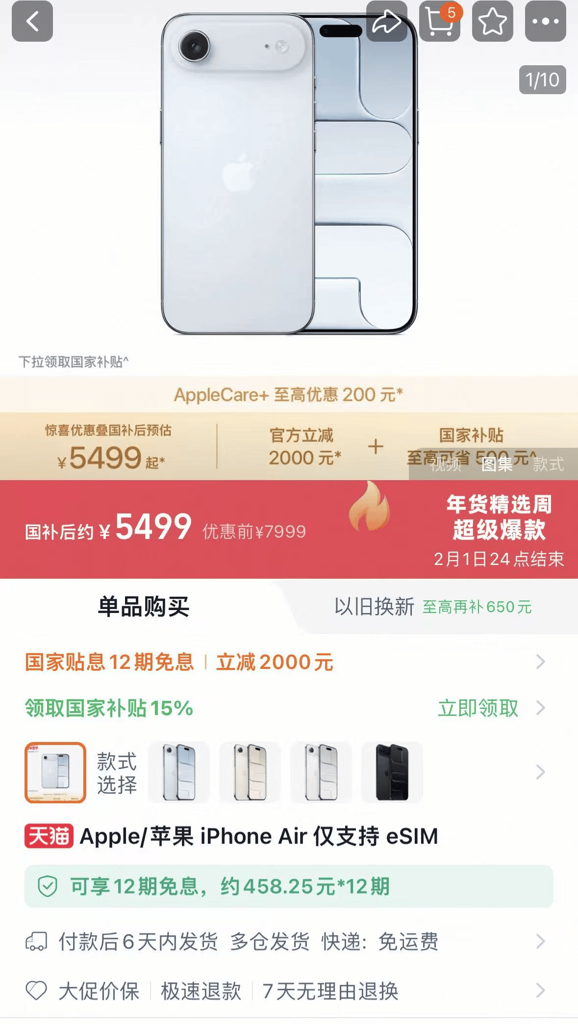1月23日晚,淘宝平台上的Apple Store官方旗舰店正式开启新年促销活动,其中上线仅3个多月iPhone Air全系直降2000元。其中原本定价7999元的256G版本,在大幅度降价后为5999元,刚好符合“国补”标准,用户还可叠加500元“国补”,最终实际支付价格低至5499元。据客服介绍,此次促销活动于1月25日20时正式开启,限量供应13000台。