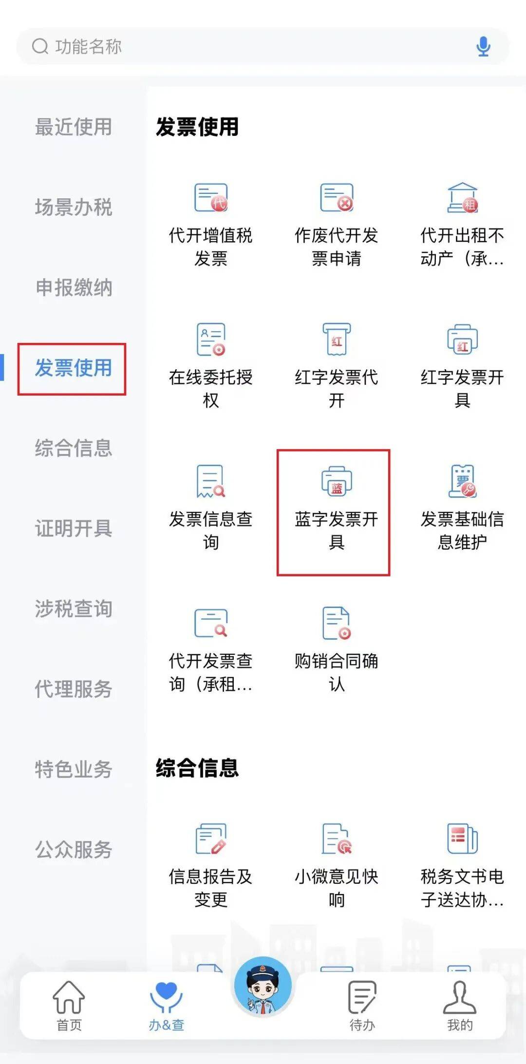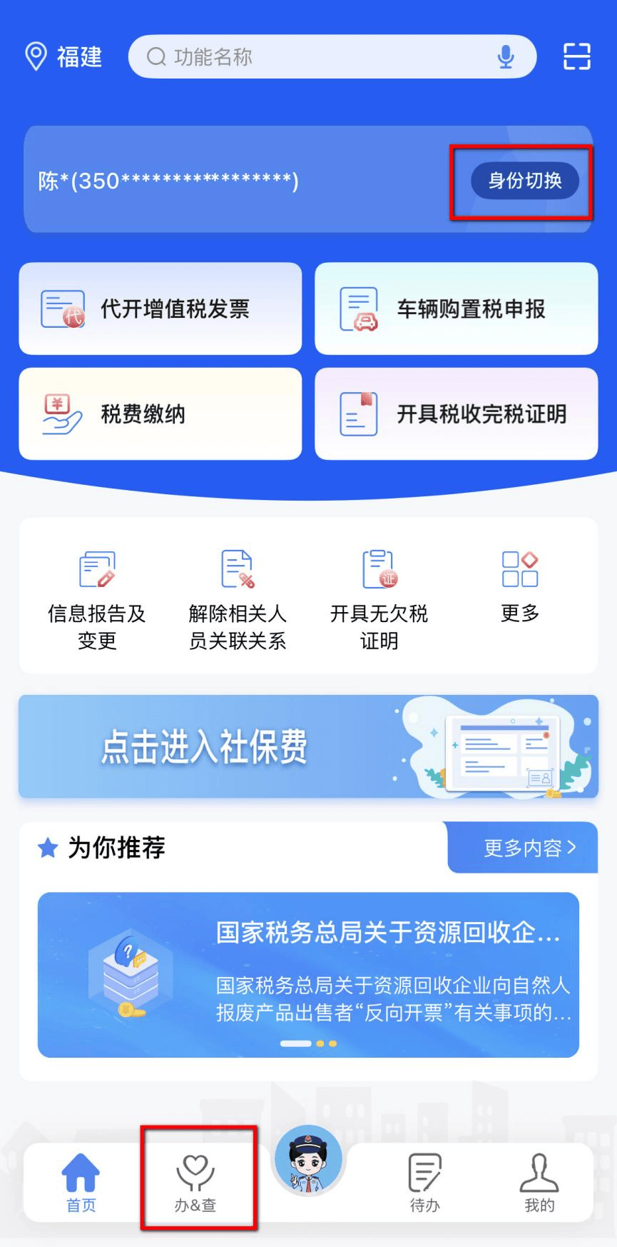 登录电子税务局APP,点击右上角【身份切换】,选择需要开票的企业账号后,点击选择【办&查】