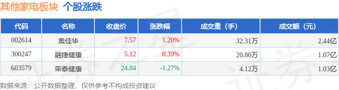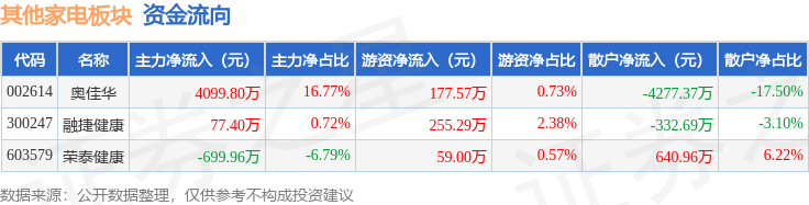 从资金流向上来看,当日其他家电板块主力资金净流入3477.24万元,游资资金净流入491.86万元,散户资金净流出3969.1万元。其他家电板块个股资金流向见下表:
