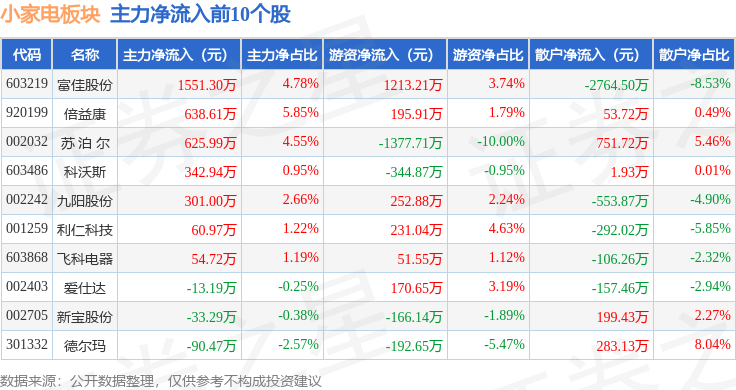 从资金流向上来看,当日小家电板块主力资金净流出6188.49万元,游资资金净流出674.43万元,散户资金净流入6862.93万元。小家电板块个股资金流向见下表:
