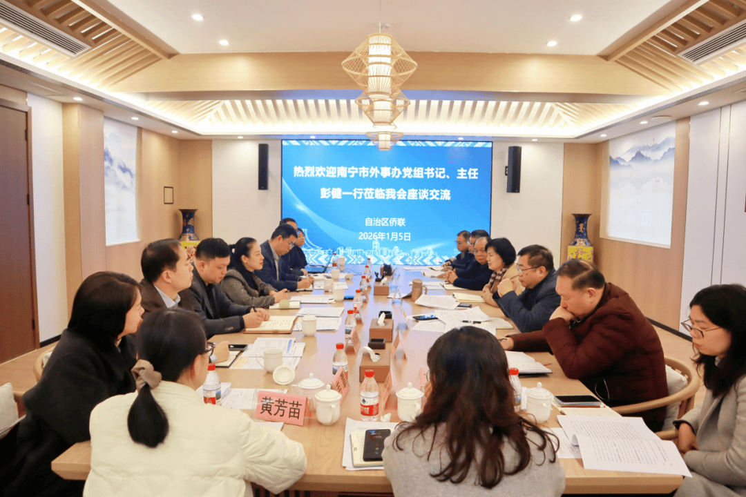 1月5日,南宁市外事办公室党组书记、主任彭健一行到访自治区侨联,双方围绕深化侨务资源与外事工作协同联动交流座谈。中国侨联兼职副主席,自治区侨联党组书记、主席陈洁英出席座谈。
