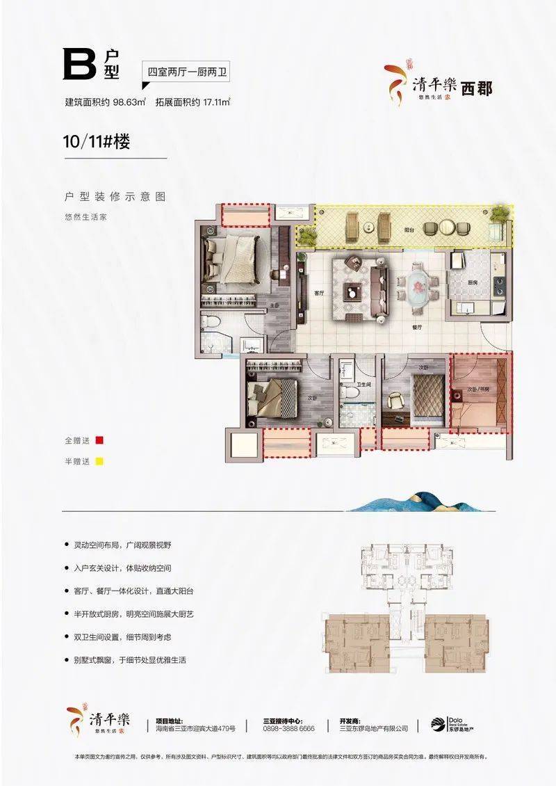 82㎡三房,100㎡四房,超高得房率,270度观景面,观山阅景,尽显从容。二梯四户,纯板式通透式设计,户型方正,尽享三亚生活。
