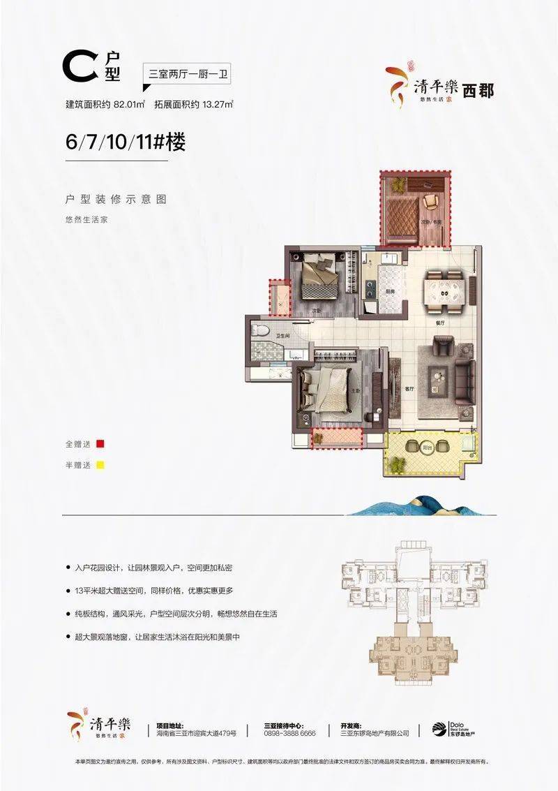 三亚清平乐的产品设计更是独具匠心。项目主打超高得房率,约82平方米的户型赠送13.27平方米,打造三房两厅一卫的舒适空间;约99平方米的户型则赠送17.11平方米,实现四房两厅两卫的宽敞布局。这样的设计不仅提高了空间利用率,更让业主在享受三亚美景的同时,拥有更加宽敞的居住体验。