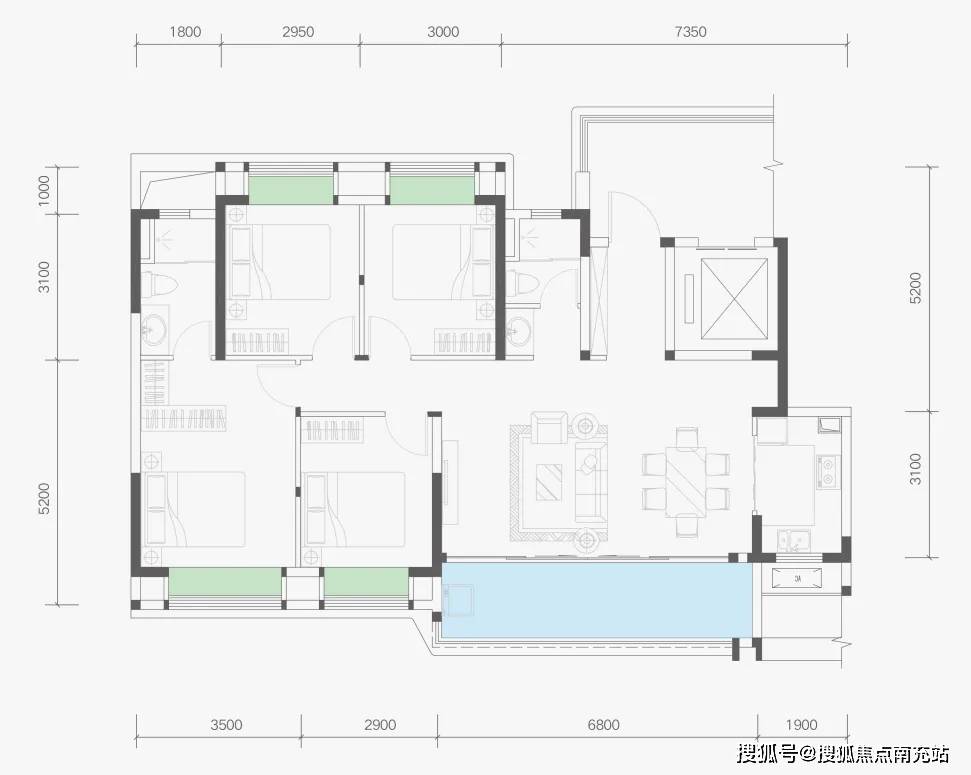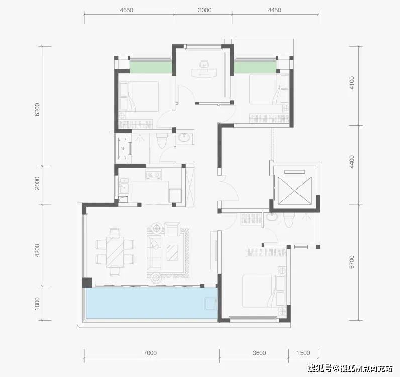 建面约143㎡户型的空间布局也借鉴了大平层和别墅的设计,入户后动线分开,一侧是客餐厅和主卧,另一侧是三间次卧,既增加私密性,又突出了主人的尊崇感。