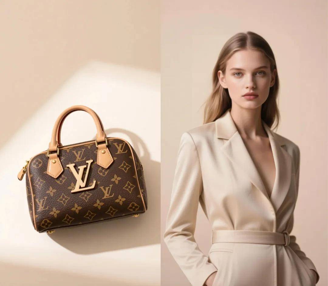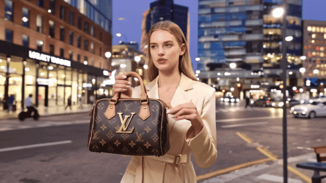 我们又上传了手袋商品图和素颜模特照,输入提示词:时尚的都市街头,这个模特拿着 LV 包,展示包的细节和质感。