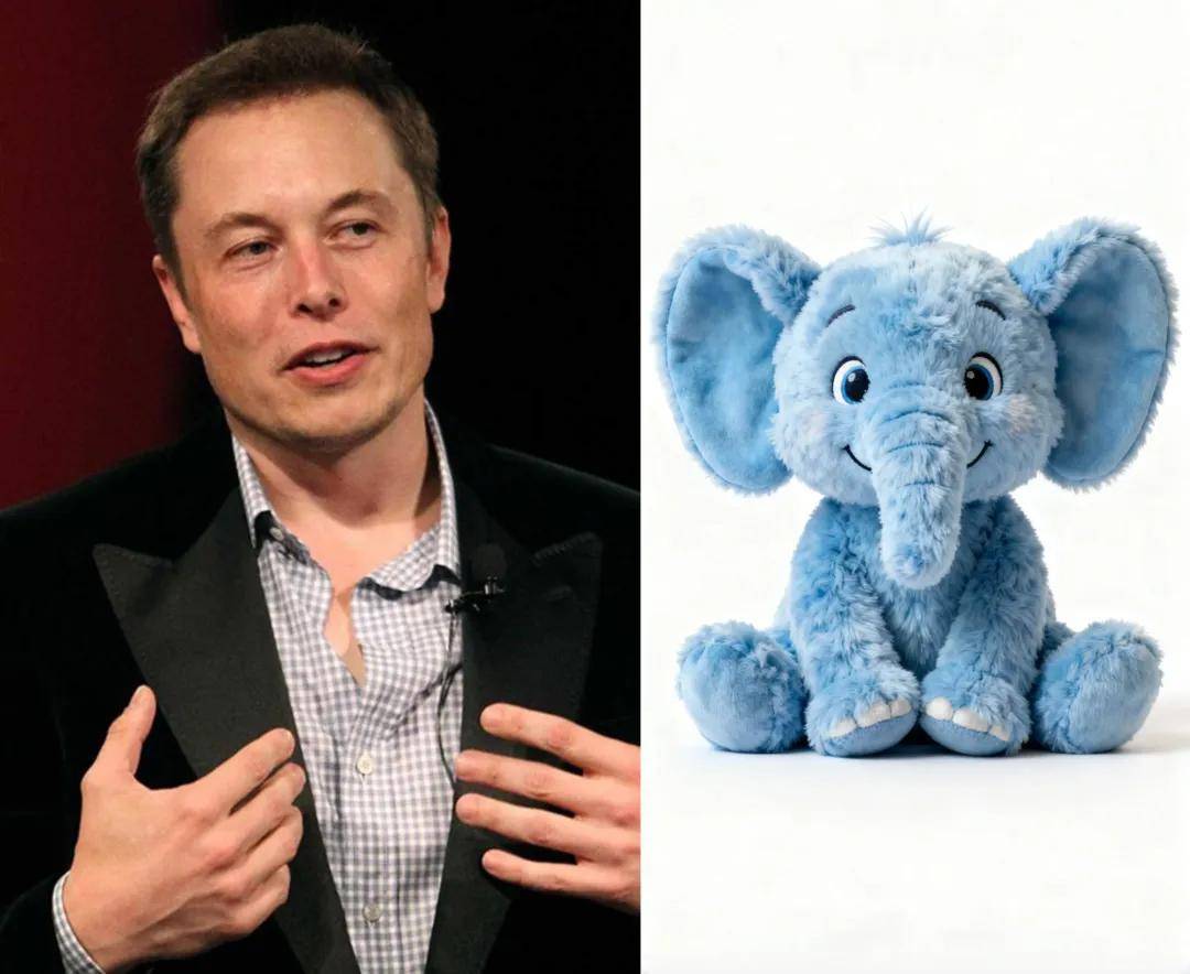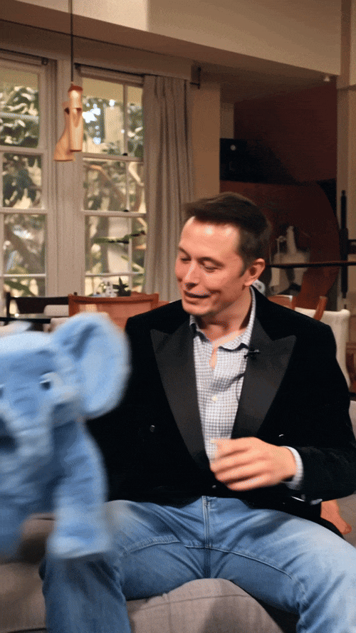 上传马斯克的照片和小象玩偶图,输入提示词:在温馨的客厅里,马斯克坐在沙发上,微笑着拿起身旁的小象玩偶,然后将玩偶举到镜头前展示,阳光从窗户洒进来,气氛温暖。