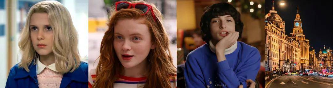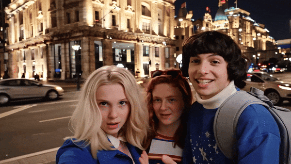 最近《怪奇物语》热度蹿升,我们上传三名小演员的剧照,外加一张上海外滩图片,输入提示词:这三个人在上海外滩自拍。