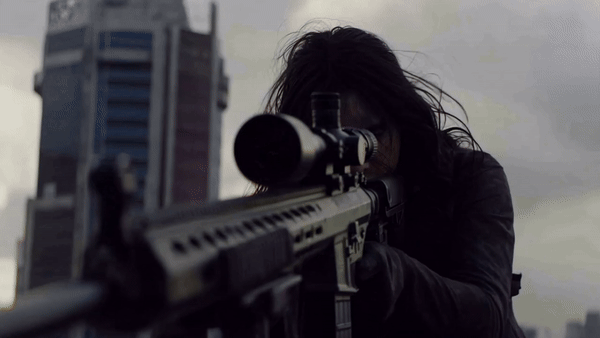 就以切入镜头为例。我们上传女杀手狙击的场面,输入提示词「Close-up on the girl's face as she aims, sweating」。
