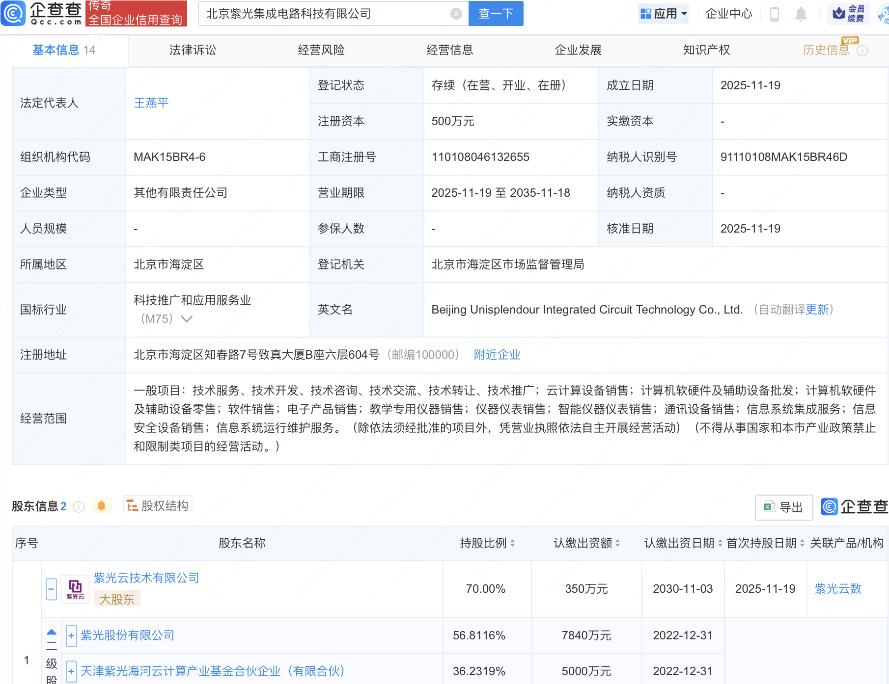 企查查APP显示,近日,北京紫光集成电路科技有限公司成立,经营范围包含:智能仪器仪表销售;通讯设备销售;信息系统集成服务;信息安全设备销售等。企查查股权穿透显示,该公司由紫光股份(000938)旗下紫光云技术有限公司等共同持股。