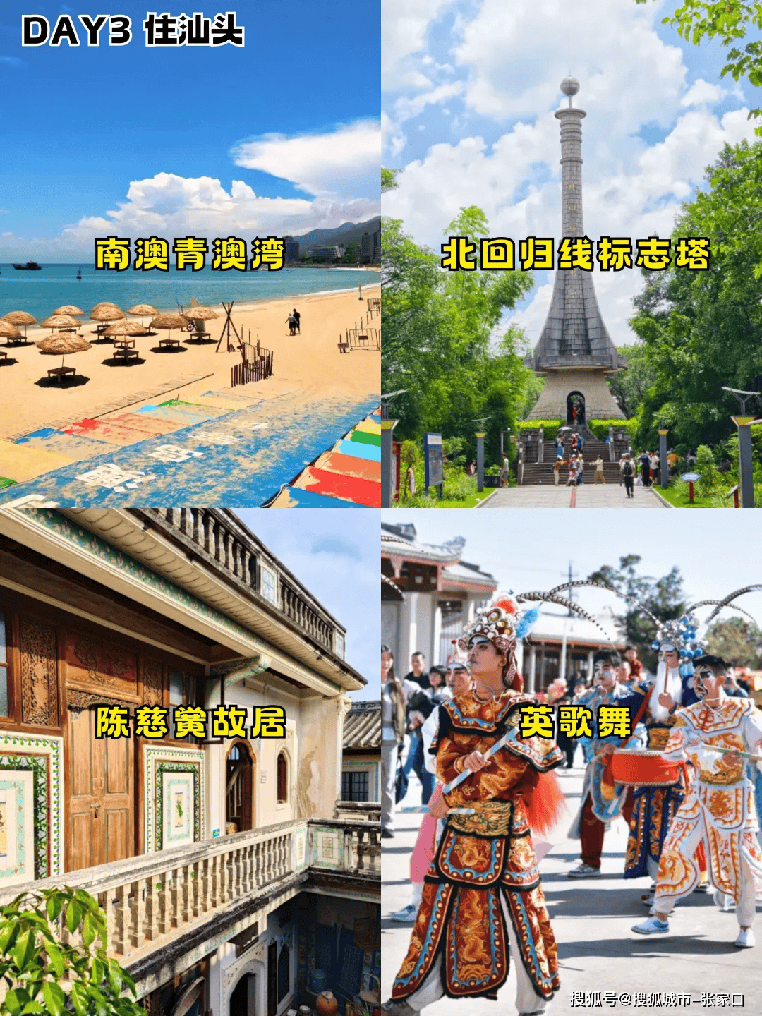 第四天:汕头市区游玩上午:参观汕头博物馆,了解汕头的历史文化和发展变迁。中午:尝试汕头的牛肉火锅,鲜嫩的牛肉在锅里涮几下就可以吃了,配上沙茶酱,味道绝了。下午:去礐石风景区,这里有奇特的自然景观和人文景观,可以俯瞰整个汕头市区和汕头海湾。晚上:在市区的夜市感受汕头的夜生活,品尝当地的特色甜品。
