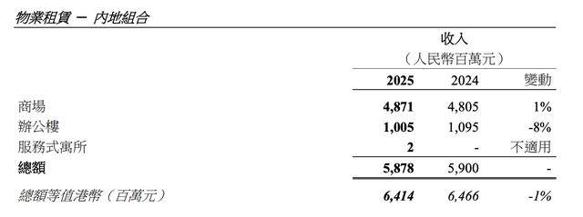 在内地物业租赁组合中,零售商业是核心,实现收入约48.71亿元,同比微增1%,扭转了2024年的下跌趋势;截至2025年底,整体出租率因租户优化调整提升2个百分点,达到96%。