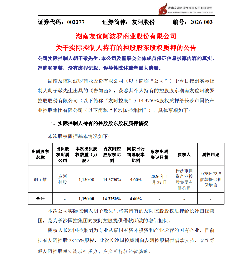 为纾解友阿控股短期流动性压力,夯实可持续经营基础,长沙国控集团计划向友阿控股提供借款支持。作为增信措施,友阿股份实际控制人胡子敬拟将个人持有的友阿控股14.38%股权质押给长沙国控集团。