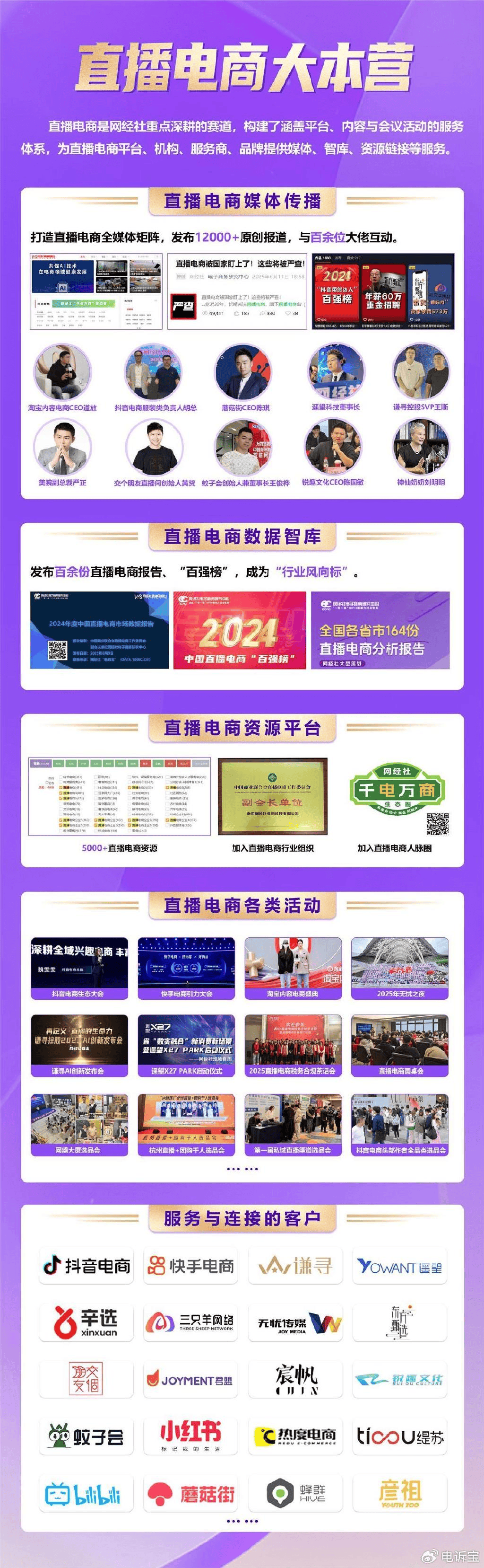 网经社深耕数字经济行业18年,长期关注直播电商,旗下直播电商台重点报道、研究与服务的有:1.平台类:淘宝直播、多多直播、京东直播、抖音电商、快手电商、苏宁直播、蘑菇街直播、唯品会直播、小红书直播、哔哩哔哩、视频号;2.MCN类:谦寻文化、美腕、辛有志严选、遥望、交个朋友、无忧传媒、东方甄选、与辉同行、如涵、泰洋川禾、蜂群文化、大禹网络、青藤文化、宸帆、嘻柚互娱、构美、快美、古麦嘉禾、二咖传媒、热度电商、集淘、洋葱视频、侵尘文化、乾派文化、仙梓文化、缇苏、彦祖文化、君盟、白兔控股、愿景未来、优蜜、全尚文化、锐趣文化、三只羊网络、奇东传媒、麦芽传媒、奇光传媒;3.服务商类:有赞、微盟、魔筷科技、蚊子会、小鹅通、商派、大商创、红呗、米络星传媒、众灿互动、银河众星、巨鲸帮帮、云犀直播、影行天下、索象、微赞直播、微吼直播、有播、优大人、蝉妈妈、飞瓜数据;4.电商主播类:李佳琦、蛋蛋、辛巴、罗永浩、董宇辉、时大漂亮、广东夫妇、疯狂小杨哥、太原老葛、蜜蜂惊喜社、香菇来了、贾乃亮、董先生、陈洁kiki、烈儿宝贝、刘媛媛、高芋芋、多余和毛毛姐、小小101、麦小登、老吴很帅、陈三废姐弟、国岳、彩虹夫妇、黄宥明、骆王宇、郝劭文、李宣卓、董洁;5.生活服务电商类:美团 携程。