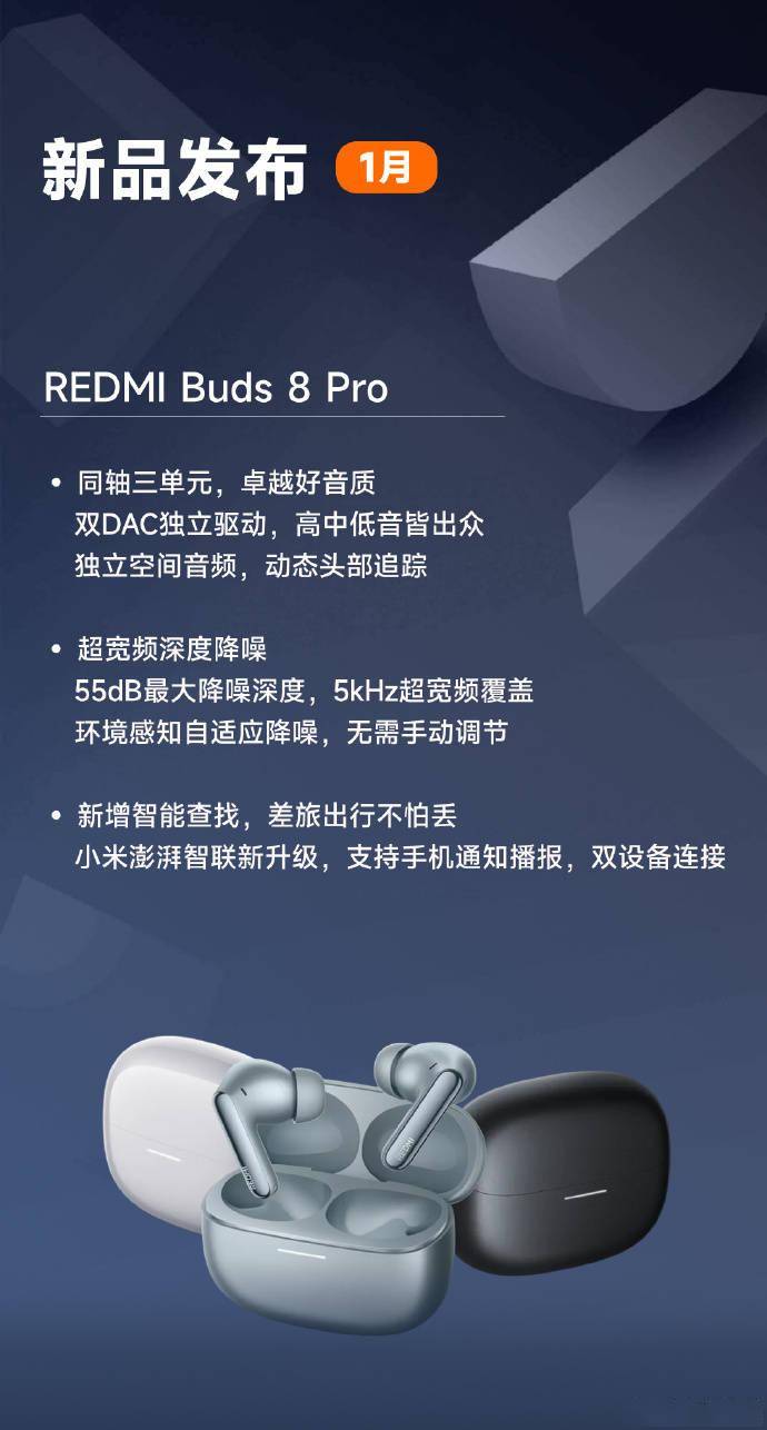 同时全新 REDMI Buds 8 Pro 也在本月登场,拥有同档罕见圈瓷同轴三单元,新增了实用的智能查找功能。