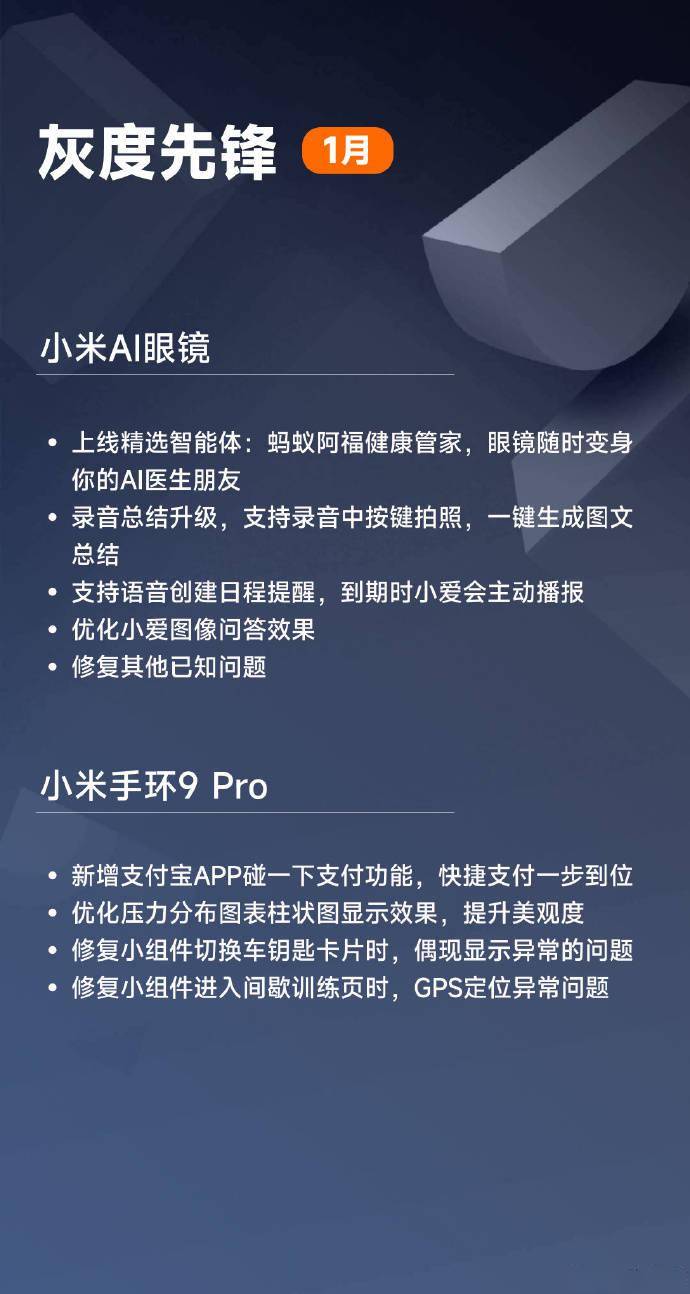灰度先锋活动中,小米 AI 眼镜新增“蚂蚁阿福健康管家”、录音拍照总结、语音建日程和图像问答优化;小米手环 9 Pro 上线支付宝“碰一下”支付,优化压力图表显示,并修复多项稳定性问题。