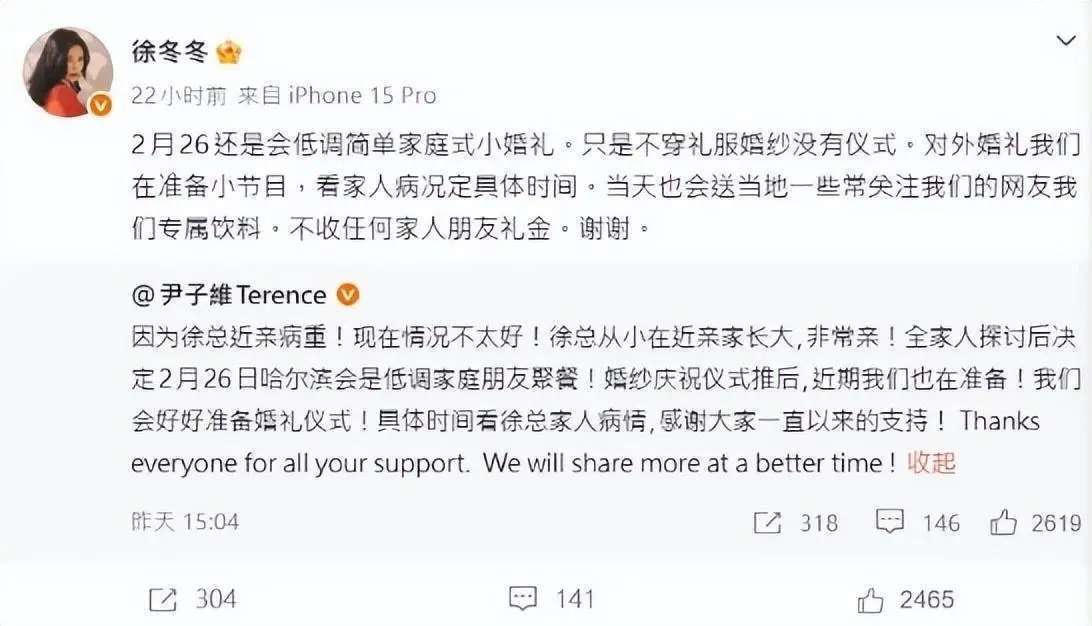 娱乐圈中有一种常常被忽视的能力,那就是学会退一步。徐冬冬决定取消婚礼的消息让我不禁想到了一个词——分寸感。原本她与尹子维计划在2月26日,在冰雪覆盖的哈尔滨举行一场盛大的婚礼,宾客名单早已定下,且一度多次公布,场面预计会异常盛大。那场婚礼,想必酒席上的广告合同早已谈好。然而,就在距离婚礼举行只有几周的时刻,尹子维却做出了令人意外的决定,将原定的大宴席缩减成了一个小范围的聚餐。至于变动的原因,倒是简单明了——长辈生病了。