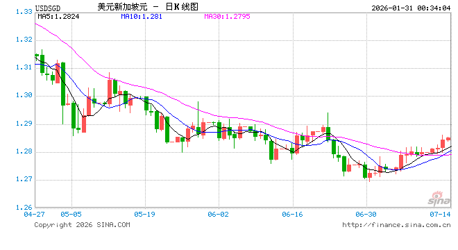 新浪外汇消息2026年01月31日,截至00时33分,外汇市场上美元兑新加坡元汇率突破1美元兑换1.2705新加坡元。涨幅为0.5063%