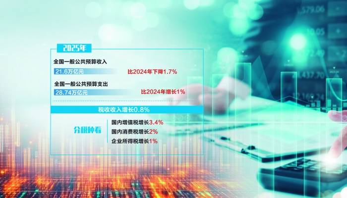 财政部1月30日发布的数据显示:2025年,全国一般公共预算收入21.6万亿元,比2024年下降1.7%;同时全国一般公共预算支出28.74万亿元,比2024年增长1%。