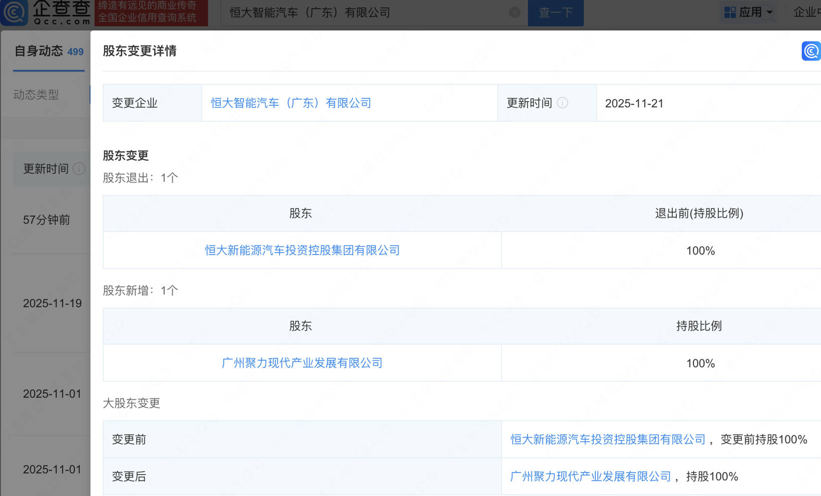 陷入债务危机已久的恒大汽车迎来关键性转折。近日,盖世汽车从企查查APP获悉,恒大智能汽车(广东)有限公司、恒大新能源汽车(广东)有限公司发生工商变更,原股东恒大新能源汽车投资控股集团有限公司退出,新增广州国资旗下广州聚力现代产业发展有限公司为全资股东。
