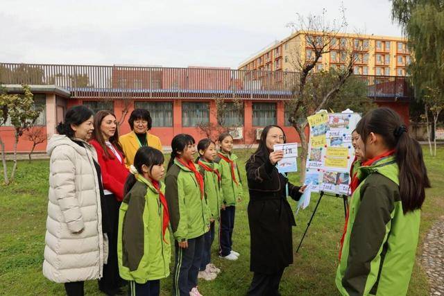 在特色课程观摩环节,代表团深入体验了学校多元的教学场景。小学鼓号队以激昂的演奏展现学生蓬勃朝气;美术写生课上,同学们在种植园中以自然为素材执笔创作;锦鲤池边的“场景英语”课堂则通过实景互动激发语言学习兴趣,凯瑞女士欣然加入交流,与同学们畅谈锦鲤趣事,课堂氛围轻松热烈。此外,代表团还走访国际部教室,与来自9个国家的学生亲切互动,并参观校史馆,全面了解学校发展历程与办学成果。