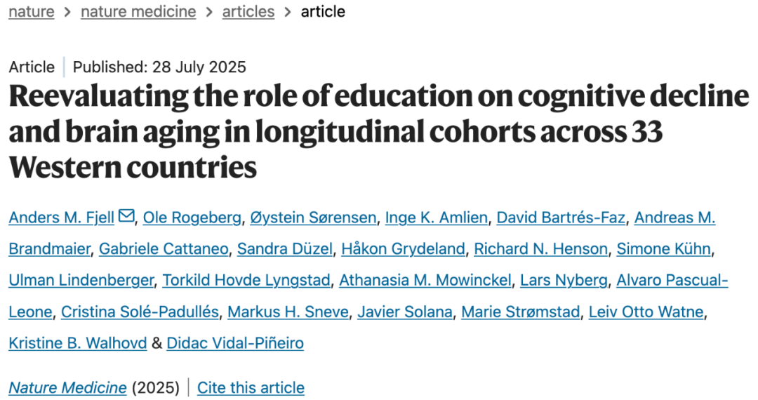 [1]Fjell, A.M., Rogeberg, O., Sørensen, Ø.et al. Reevaluating the role of education on cognitive decline and brain aging in longitudinal cohorts across 33 Western countries. Nat Med (2025). https://doi.org/10.1038/s41591-025-03828-y