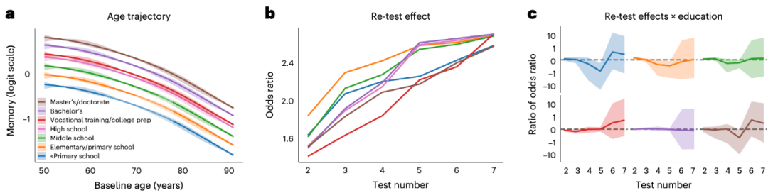 研究首先证实了一个已有共识:受教育程度越高,个体在中老年阶段的记忆能力初始表现也越强,这种趋势在不同年龄段均表现明显。然而,令人意外的是——教育水平并没有减缓认知能力随年龄下降的速度。也就是说,虽然高学历者“起跑线”更靠前,但一旦走上认知衰老之路,其“下坡速度”与低学历者相差无几。