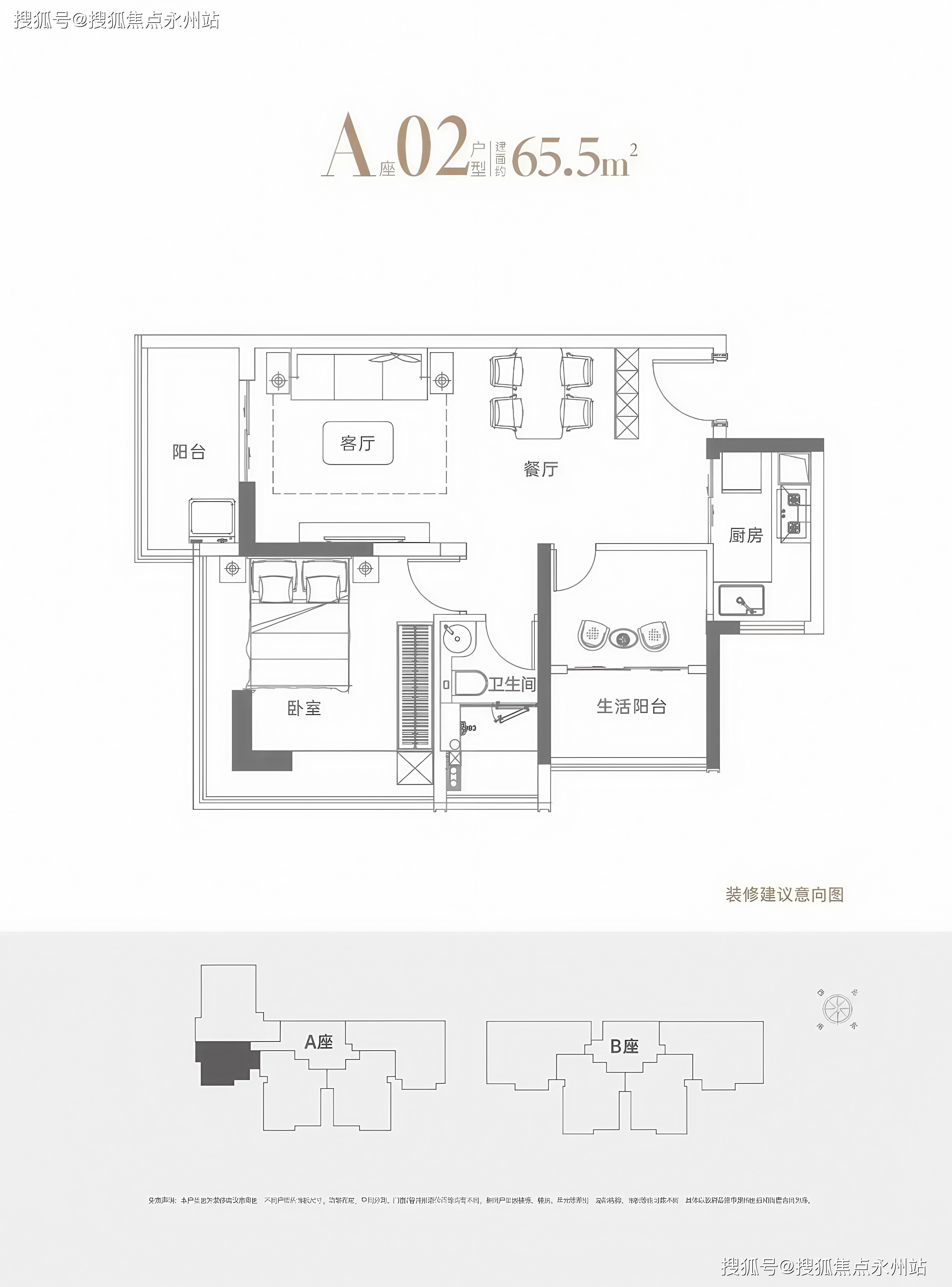建面约65.5㎡(A座02户型),西南朝向,总价约468万-497万元。