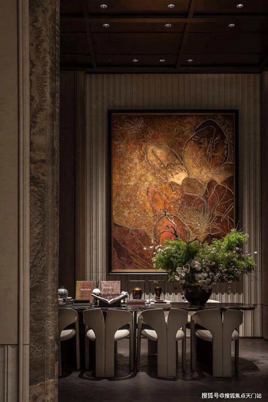 王府规制的通高大门,镶嵌昂贵天然水墨玉,自然天成的“山水画”,传递“玉出东方,门纳乾坤”的美好寓意;会客区域非遗艺术家画作《繁花映春》,耗时3月而成,诠释历久弥新的艺术价值。