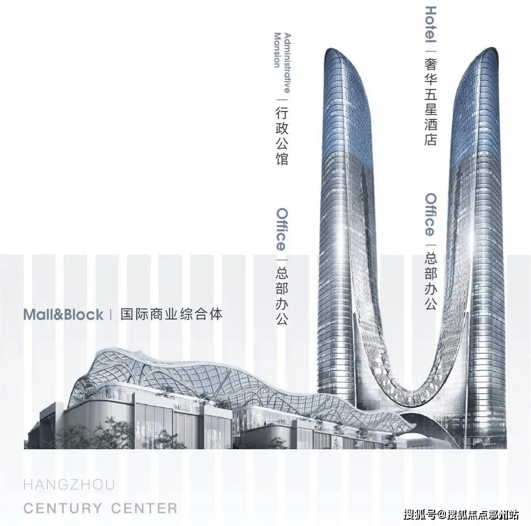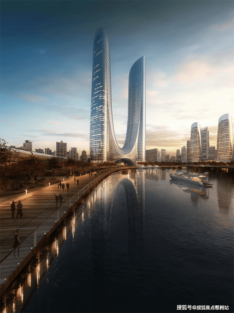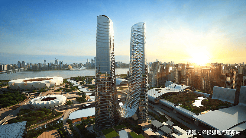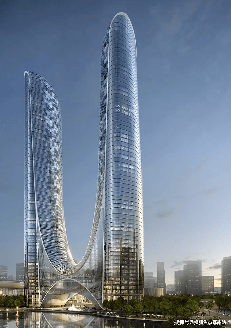 勾勒出城市崭新的天际线。双塔中间相连的弧线借鉴了杭州的特色景观——西湖断桥、