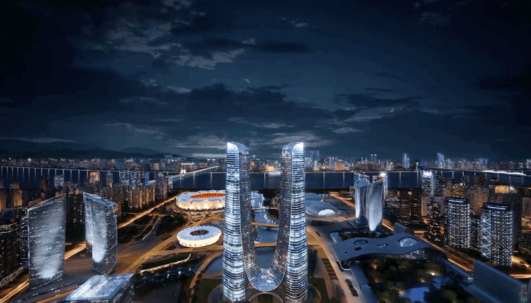 玲珑剔透、流畅纤细,直插云端。涵盖摩天双塔、星级酒店、行政公馆、总部办公基地、时尚文化商业等丰富业态。目前是在建的“杭州第一高楼”。