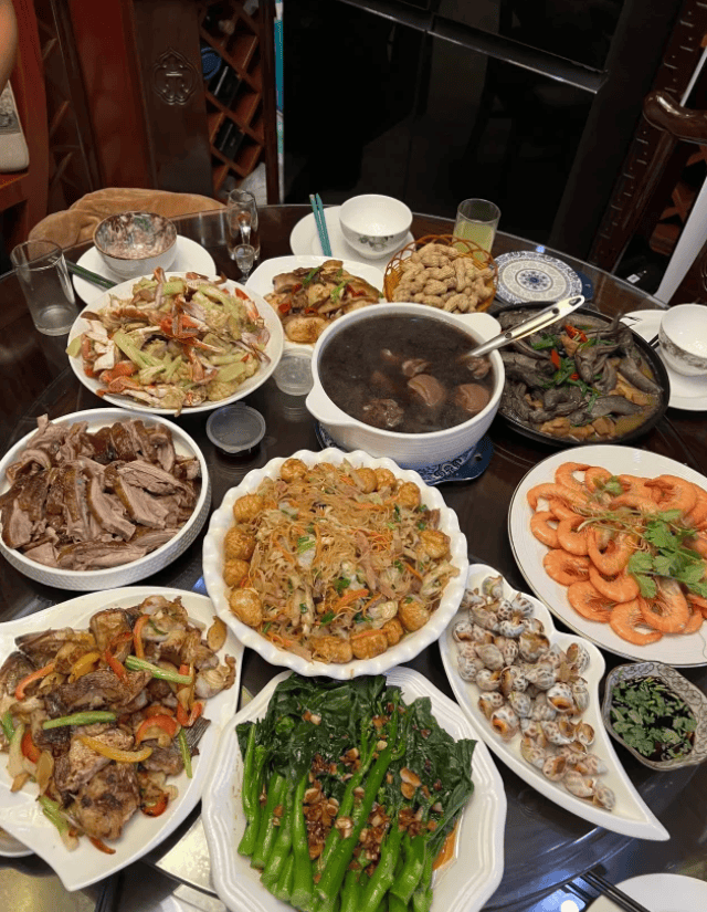 中午,小纤带我们去了她精心挑选的最后一家餐厅,品尝潮汕“围炉”——春节期间的家庭聚餐形式。“虽然还没到除夕,但可以提前感受下氛围。潮汕围炉的菜肴都有吉祥寓意,比如鱼是‘年年有余’,虾是‘笑哈哈’,蚝豉是‘好市’……”餐桌中央真的摆着一个传统炭炉,锅里炖着浓香的羊肉,周围摆满了各种菜肴,热闹又温馨。