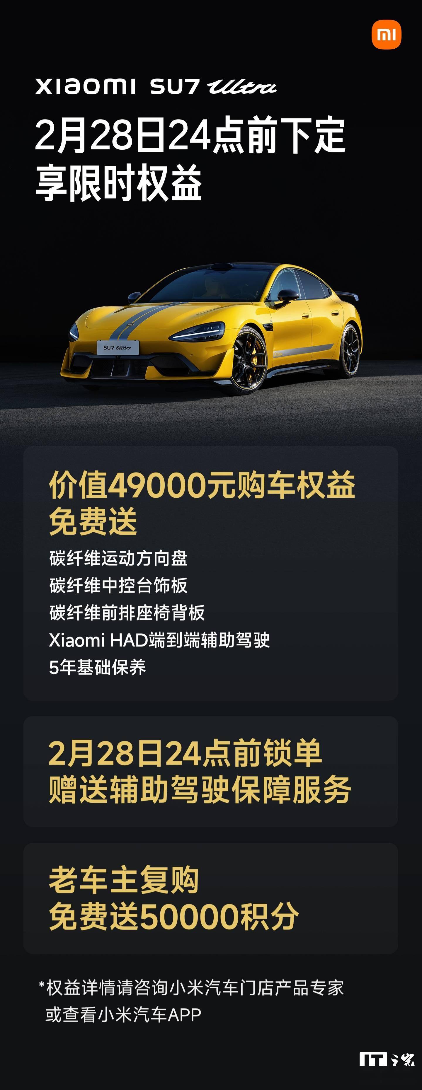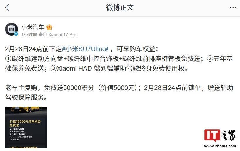 IT之家 2 月 1 日消息,小米汽车官方今日公布了 SU7 Ultra 限时购车权益,2 月 28 日 24 点前下定小米 SU7 Ultra 可享购车权益: