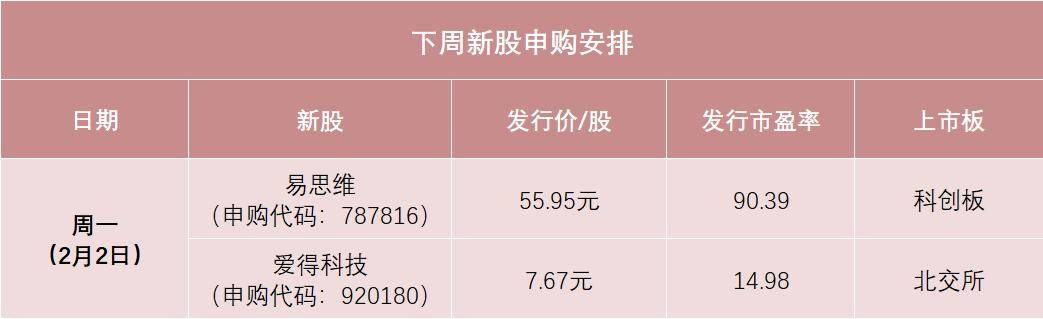 根据目前的发行安排,下周有2只新股申购,均在周一(2月2日),分别是科创板新股易思维、北交所新股爱得科技。