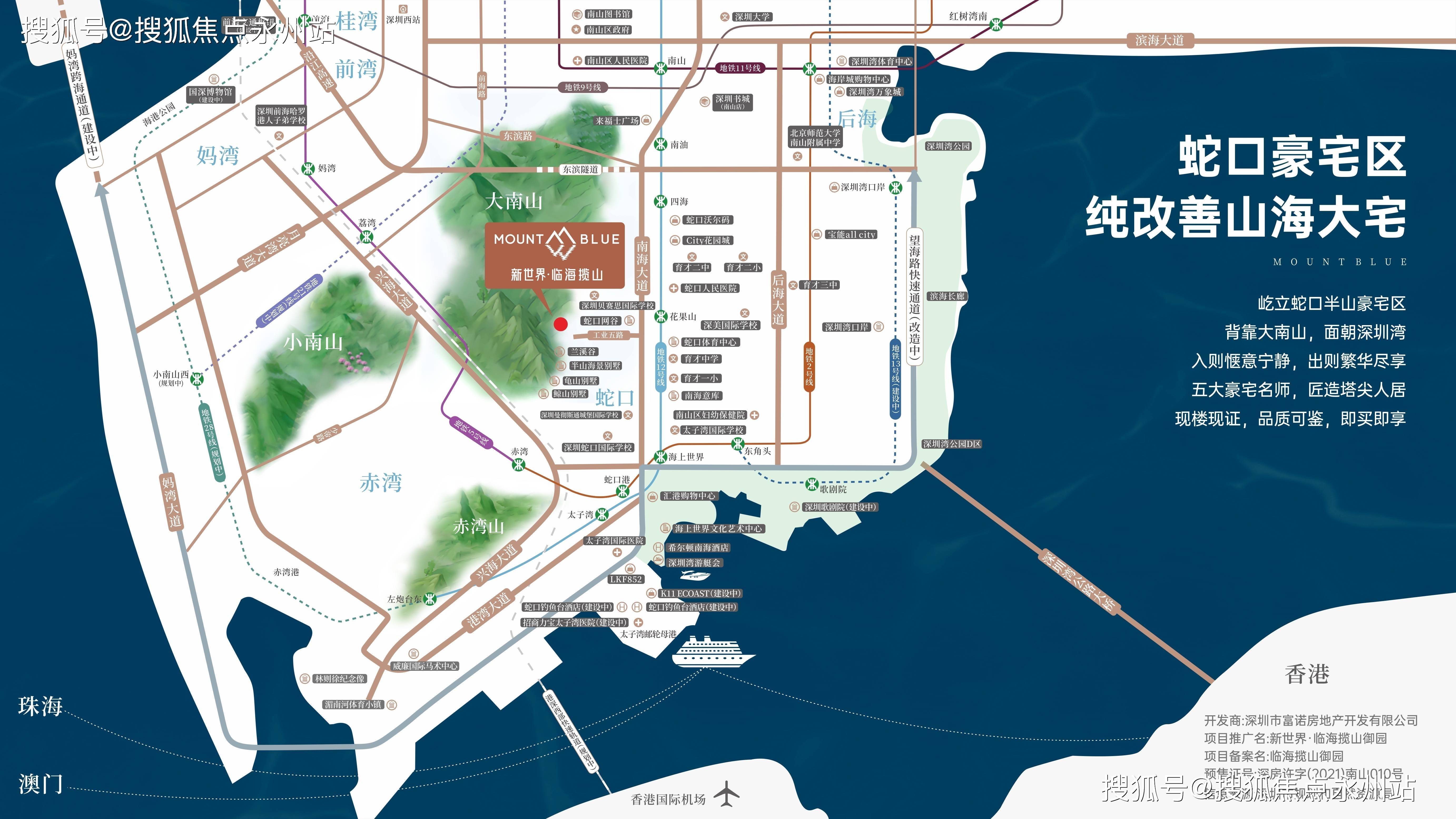 项目位于蛇口半山豪宅区,紧靠着大南山,临近12号线花果山站、地铁2号线水湾站、海上世界站。