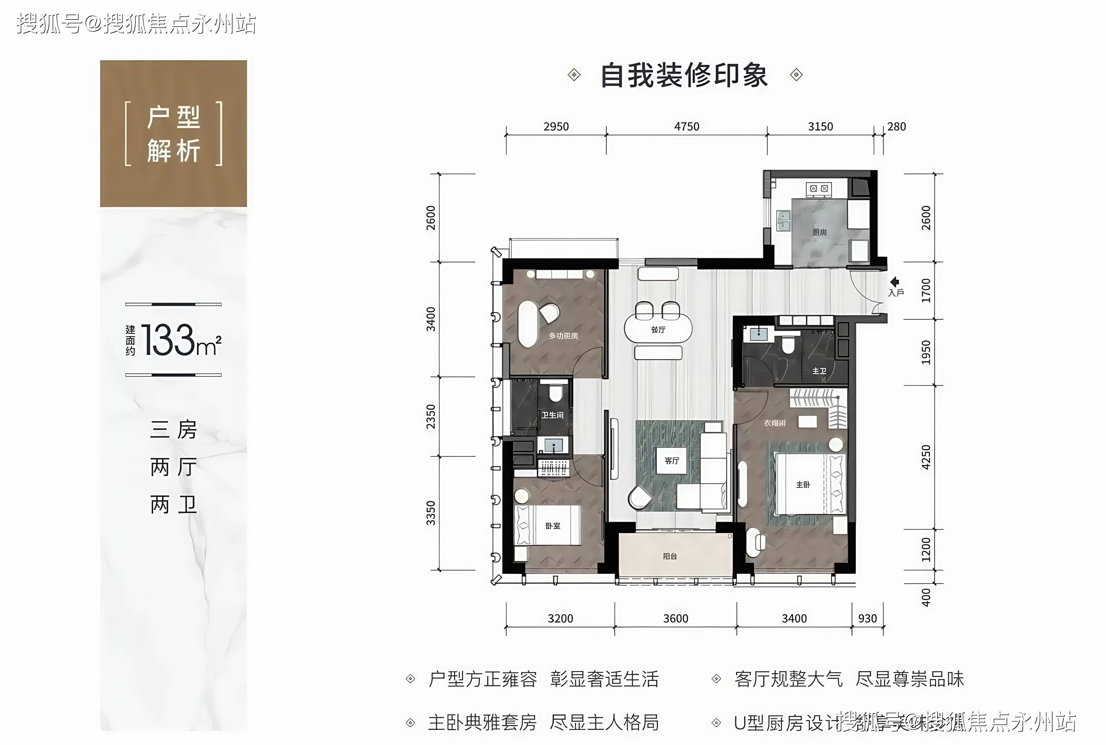 公寓133㎡3房2厅2卫:端头户型,双面采光,通透对流,双龙抱珠,户型方正,卧室开间阔绰,实用率高,U形厨房,操作面大,空间利用率高,厅出阳台,3.15米层高,通燃气,舒适宜居,双面景观,可观山景,可赏园林景观。