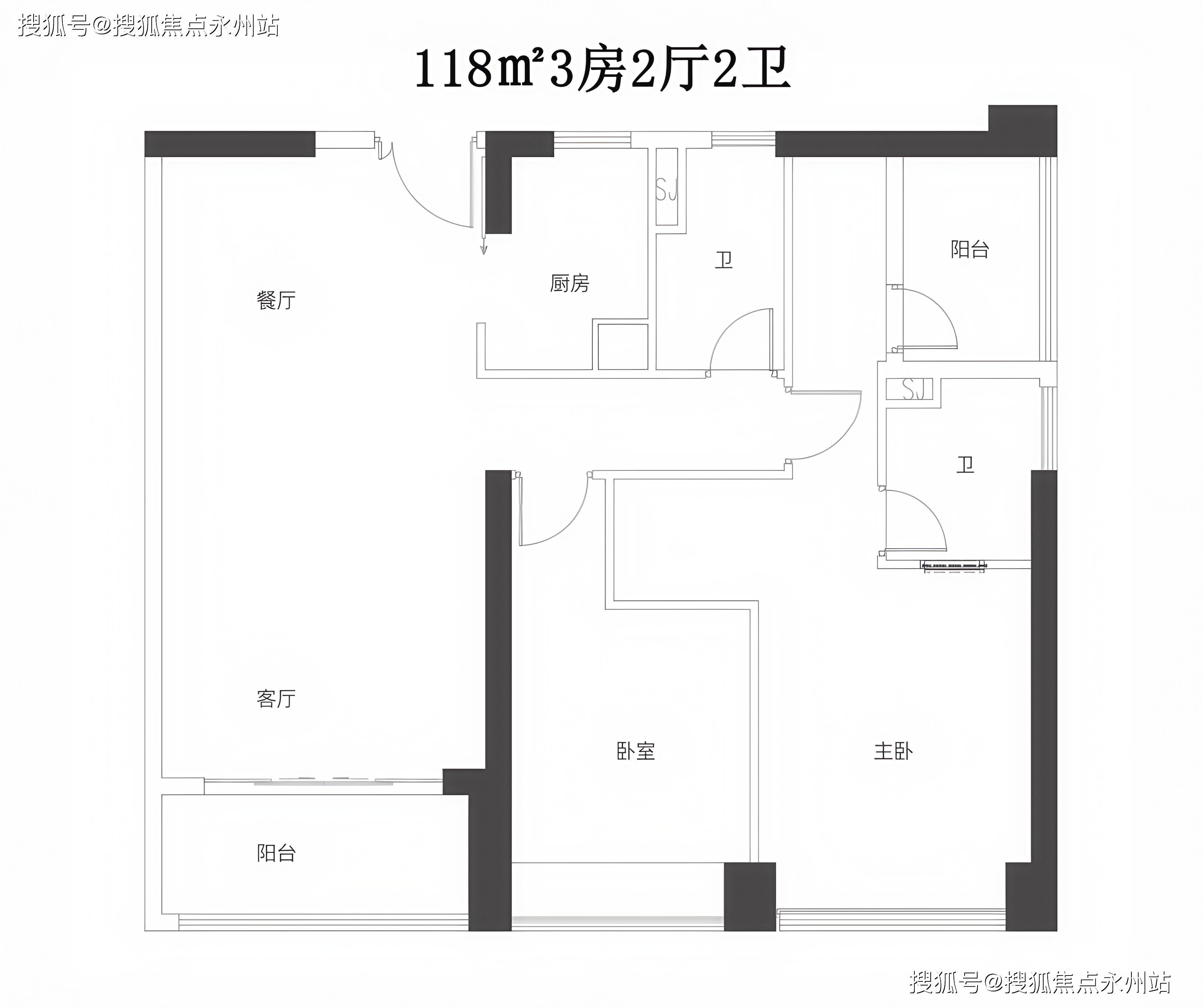 118㎡3房,单价10.8万/㎡起,总价约1280万起