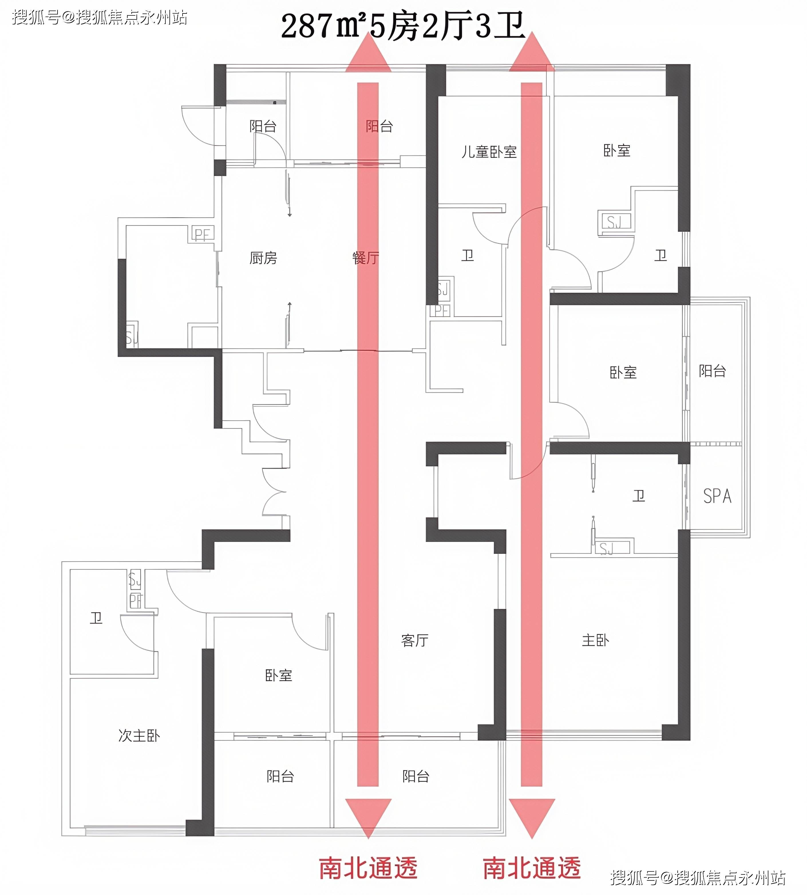246㎡4+1房2厅2卫竖厅:项目客厅、四个房间全正南向,观城市景观及海景,双主卧套间设计,带独立衣帽间,卫生间双台盆,全屋无暗房暗卫。