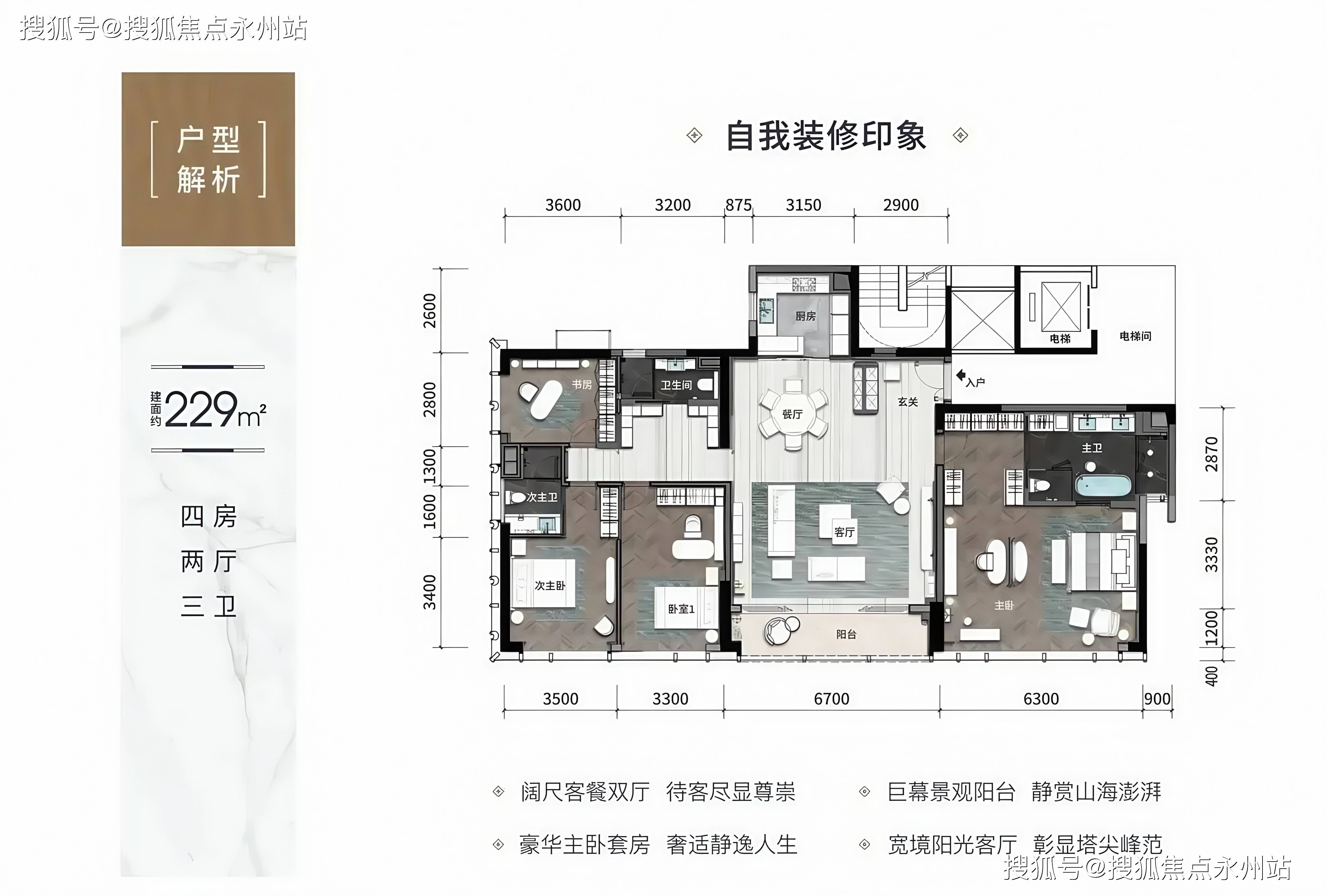 公寓229㎡4房2厅3卫:3.3米层高,6.7米客厅开间,舒适度高,配置较多落地窗,视野通透,空间敞亮感十足,可享受三重景观:山景、海景、城市景观,主卧大套房设计,十分奢华,户型灵动可变,实用型4房可变享受型双主卧3房。