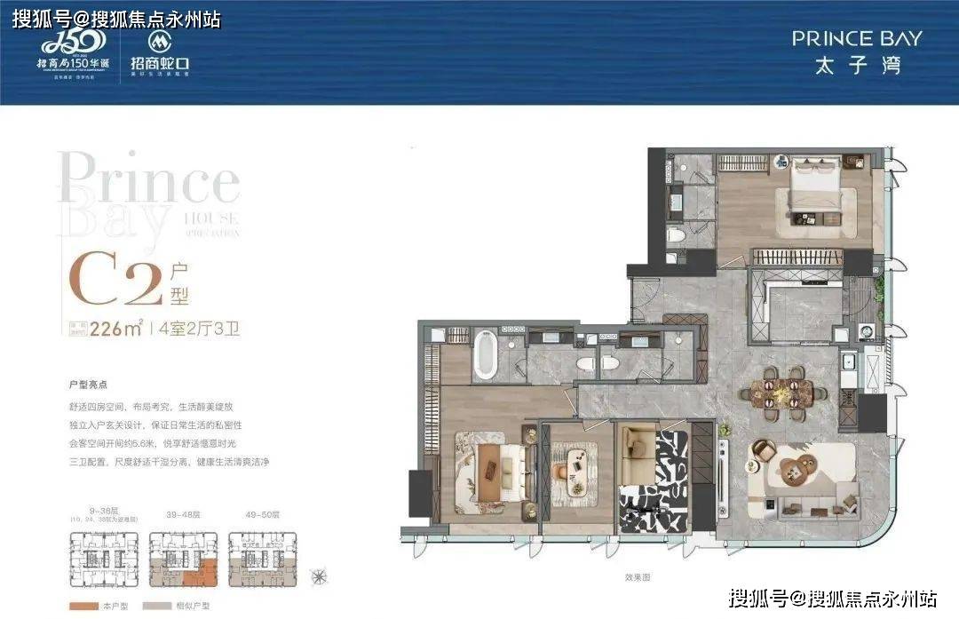 【太子湾•泓玺】总高194米,共1栋,分为顶高低三个区域,低区9-38层4梯8户,面积为88-95-115-125㎡;高区39-48层4梯6户,面积为88-115-226㎡;顶层49-50层4梯4户,面积为216-226㎡,