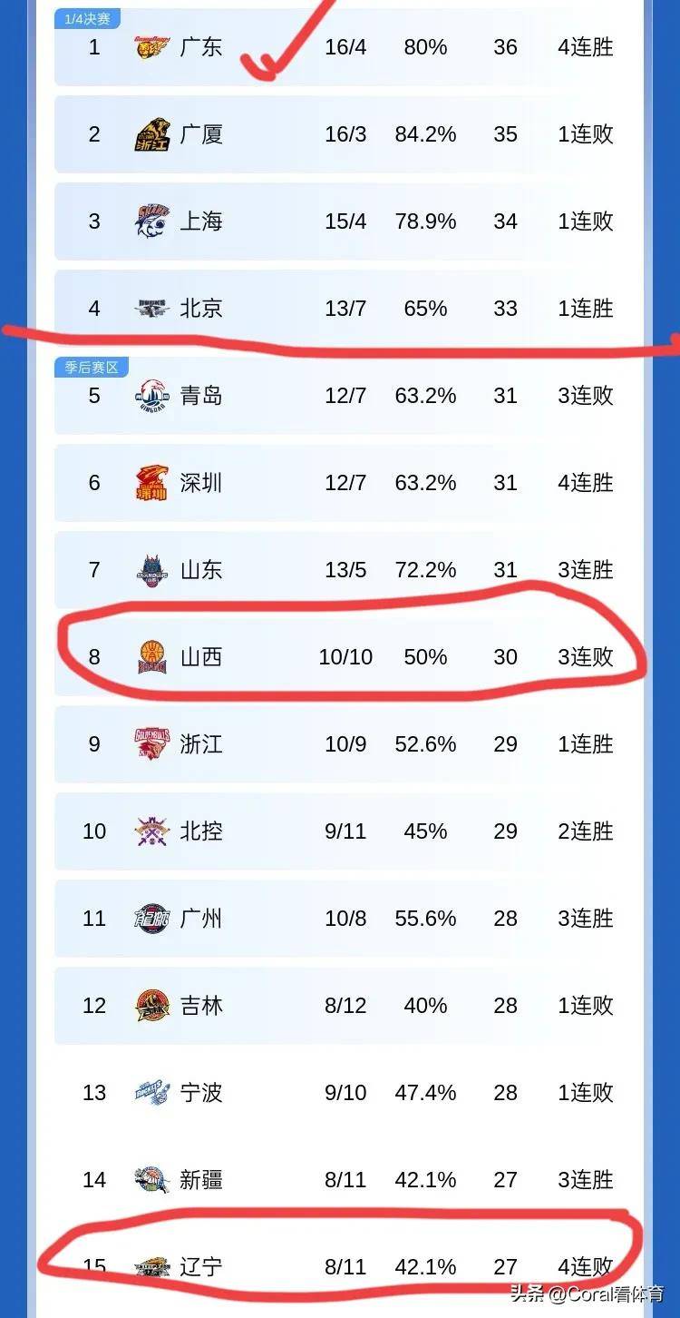 今夜过后,CBA排名又发生变化,由于昨天广厦输给了山东,遭遇赛季第3败,广东则是4连胜以1分的优势力压广厦登上榜首,不好的消息是,焦伯乔在此后的潜力赛中受伤。北京战胜山西后重返1/4决赛区。辽宁4连败后已经跌到第15,不过离附加赛仅差1分,还是有希望争取到1个季后赛名额。山西上赛季还是联赛第2,本赛季10胜10负,仅排在第8,实力确实下滑明显。