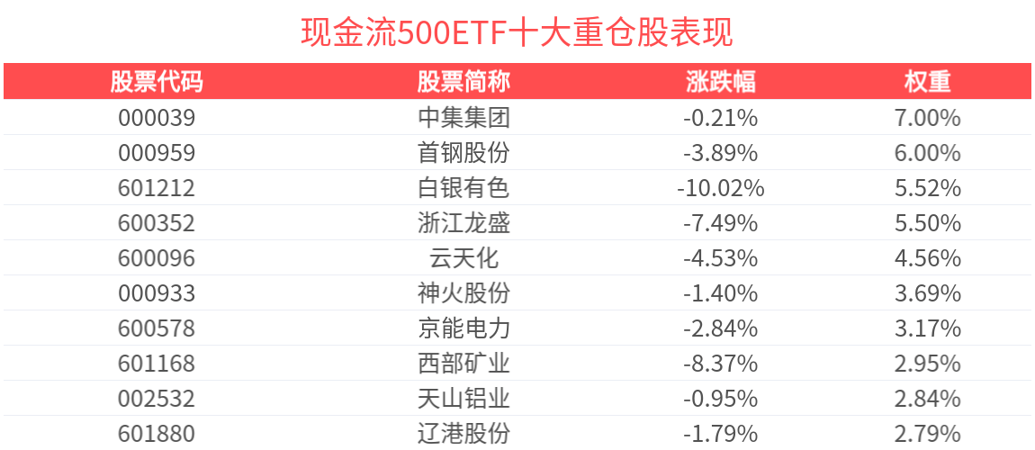 现金流500ETF(560120)紧密跟踪中证500自由现金流指数,中证500自由现金流指数从中证500指数样本中选取50只自由现金流率较高的上市公司证券作为指数样本,以反映中证500指数样本中现金流创造能力较强的上市公司证券的整体表现。数据显示,截至2026年1月30日,中证500自由现金流指数前十大权重股分别为白银有色、浙江龙盛、首钢股份、中集集团、云天化、神火股份、西部矿业、天山铝业、京能电力、辽港股份,前十大权重股合计占比48.63%。