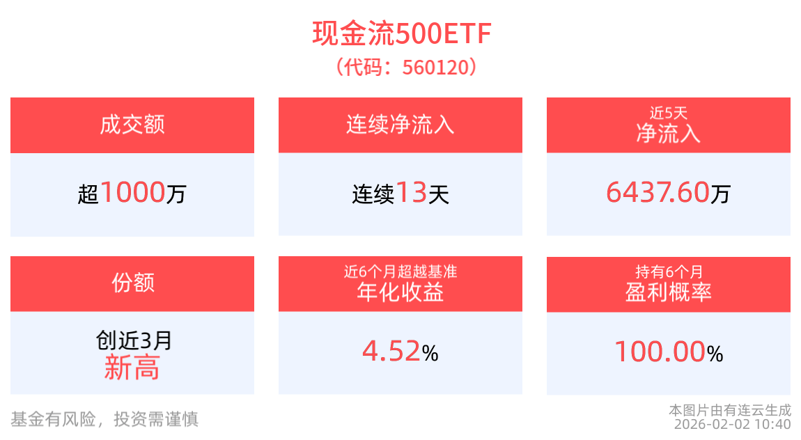 截至1月30日,现金流500ETF近6月净值上涨44.81%。从收益能力看,截至2026年1月30日,现金流500ETF自成立以来,最高单月回报为18.04%,最长连涨月数为3个月,最长连涨涨幅为15.21%,涨跌月数比为5/1,上涨月份平均收益率为7.88%,月盈利百分比为83.33%,月盈利概率为88.79%,历史持有6个月盈利概率为100%。