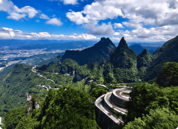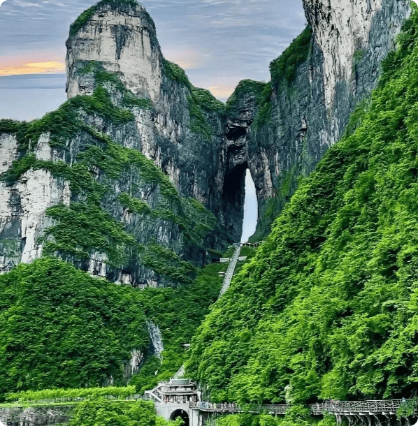 第3天:金鞭溪→天门山。早上不用起太早,8点多出发去金鞭溪,溪水清澈见底,两岸的峰林倒映在水里,树荫茂密,走在里面特别凉快,堪比天然氧吧,走累了还能坐在溪边歇一歇,吹吹晚风,特别惬意。偶尔能看到野生猕猴,小纤反复提醒我们,千万别投喂、别伸手,避免被抓伤,我们当天就看到有人伸手喂猴子,被抓伤了,处理起来特别麻烦,大家一定要注意。我们没有走金鞭溪全程,只走了精华路段,打卡了神鹰护鞭、千里相会,全程1个多小时,轻松不费力,不用累得腿软。中午吃完午饭,就前往天门山,我们选的是最省时的A线(索道上山、环保车下山),坐7455米的世界最长高山索道上山,脚下是翻涌的云海,又惊险又浪漫,恐高的闺蜜全程抓紧我的手,但还是忍不住感叹风景太绝了。走玻璃栈道的时候,虽然有点腿软,但脚下的深渊与云海交织,那种感觉真的太特别了,鞋套费5元自理,不算贵,性价比很高。最后打卡天门洞,远眺999级天梯,不得不感叹大自然的鬼斧神工,逛完天门山,小纤就送我们回民宿休息,节奏刚刚好。