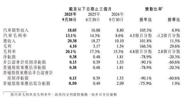 2025年第三季度,小鹏汽车总收入为203.8亿元,同比上升101.8%;汽车销售收入为180.5亿元,同比上升105.3%;净亏损为3.8亿元,2024年同期为18.1亿元;毛利率为20.1%,2024年同期为15.3%。