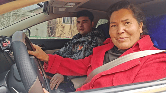 库杜斯・米曼尼亚孜与妈妈一起坐着新买的小汽车。