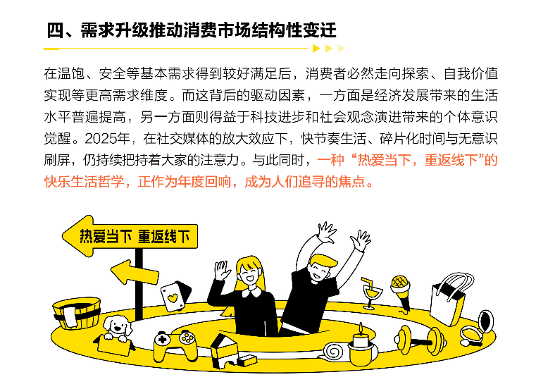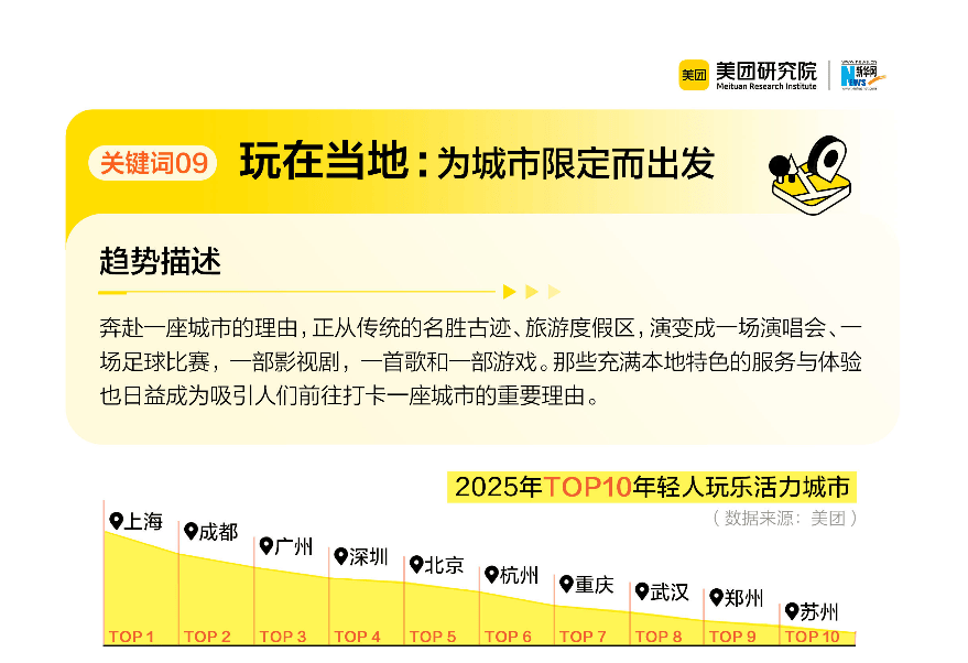 一份由美团研究院联合新华网发布的趋势报告,揭示了2025年中国生活服务消费市场的关键变化,“热爱当下,重返线下”生活哲学成为主流,消费者不再单纯追求“买得更便宜”,而是转向“活得更真实”“体验更深刻”的多元诉求。报告提炼的9大关键词——省出快乐、体验平替、乐有所值、追求确定、低耗社交、内养外练、IP联名、重返附近、玩在当地,本质上反映了消费逻辑的更新迭代。