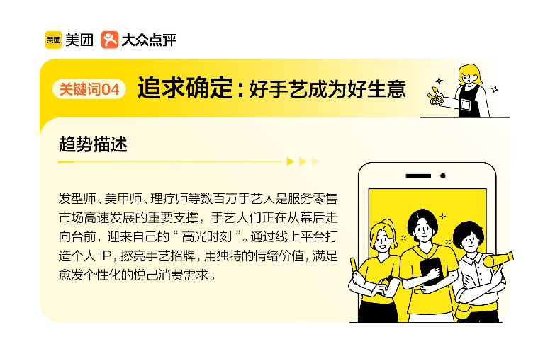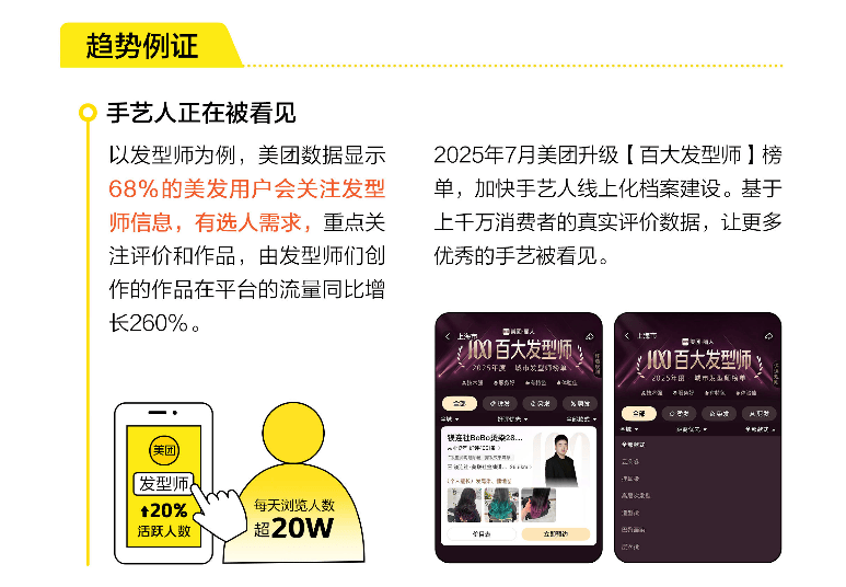 “追求确定”则聚焦于“人与人的信任连接”。当消费者不再盲目相信品牌或店铺,转而关注发型师、美甲师等手艺人的个人IP(美团数据显示68%用户会关注发型师评价与作品,相关内容流量增长260%),本质上是将消费决策从“认店”变为“认人”——手艺人的专业能力与情绪价值(如理解用户需求、提供个性化建议)成为关键信任纽带。71%的消费者愿意为靠谱发型师跨城消费,甚至通勤52.5分钟,这种“追星式理发”现象说明:在高度不确定的生活中,“稳定的专业交付”与“被认真对待的感觉”比价格更重要。
